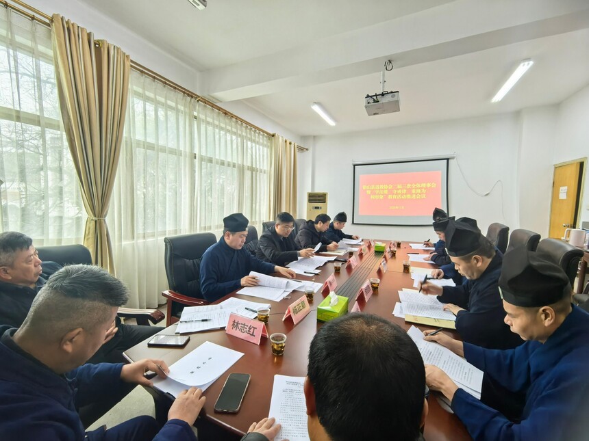 2026年1月29日,铅山县道教协会二届三次全体理事会暨“学法规、守戒律、重修为、树形象”教育活动推进会议、2025年度班子考核会议、全面从严治教检视会议在县道教协会召开,县委统战部有关负责同志到会指导。县道教协会会长黄样辉主持会议。会议传达学习了党的二十届四中全会精神、习近平总书记在中共中央政治局第二十三次集体学习时的重要讲话精神、王沪宁会见中国道教协会领导班子成员时的讲话精神、中国道教协会第十一次全国代表会议精神、江西省道教协会四届二十一次会长(扩大)办公会议暨“学法规、守戒律、重修为、树形象”教育活动推进会议精神,以及《人员密集场所动火作业安全指引》等文件精神。会议总结了县道协2025年工作,部署了2026年工作计划,审议了2025年度财务收支情况,听取了县道协“学法规、守戒律、重修为、树形象”教育活动开展情况汇报,部署了下一步工作,并组织班子和班子成员开展述职、检视、民主测评工作。